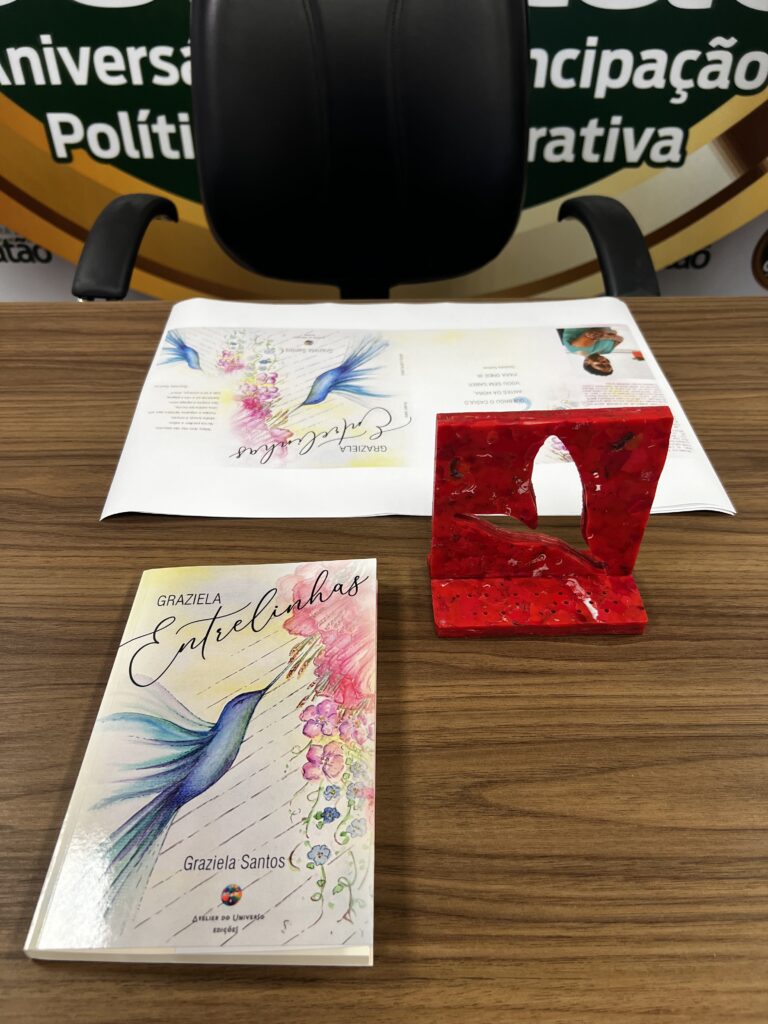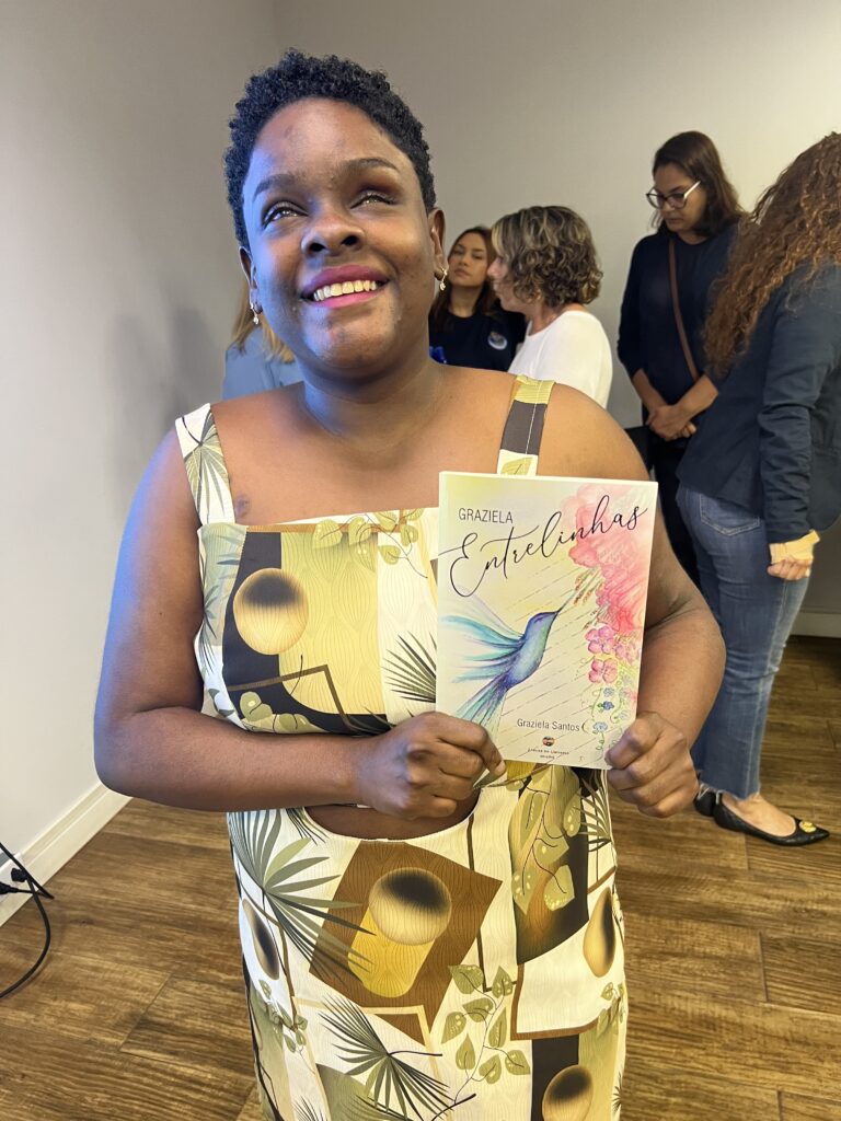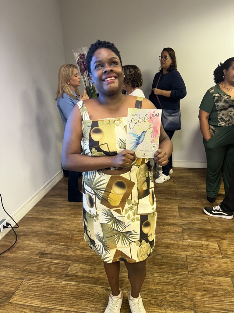 A Graziela agradeceu a presença de todos, fez uma auto descrição e disse que não imaginava um dia realizar o sonho de menina que era apenas ser escritora.